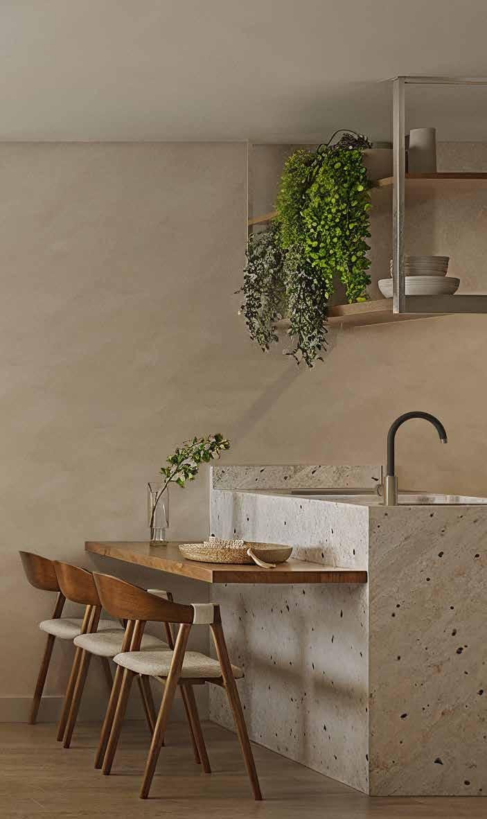 A escolha dos materiais e acabamentos também buscou criar outro tipo de contraste, contrapondo superfícies lisas e revestimentos mais porosos e irregulares. Assim, integrando a forma dos elementos, a função do espaço e expressão dos materiais, cada ambiente busca acolher, mas também impressionar, combinando surpresa e familiaridade."